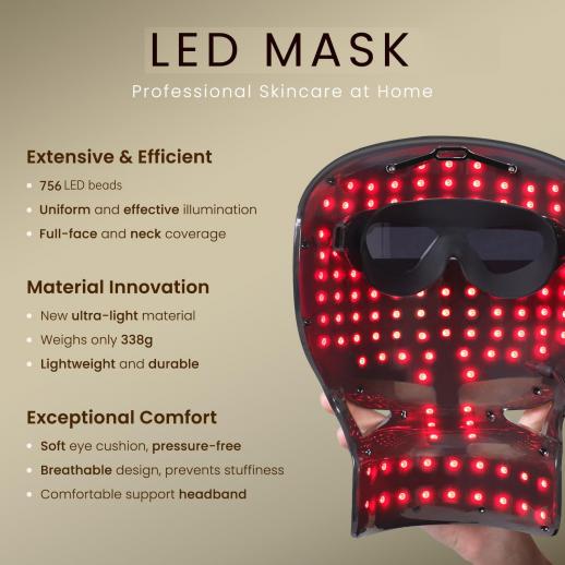 Masque de Luminothérapie LED Professionnel 8 Couleurs – 756 LED Masque LED pour le Visage et le Cou, Soin Anti-Imperfections, Éclat & Anti-Âge à Domicile