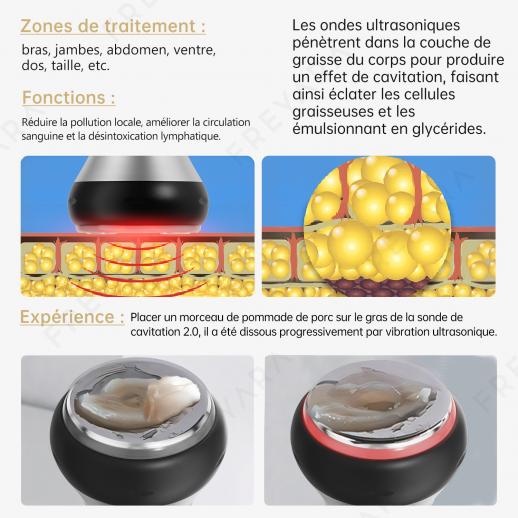 L'onde sonore émise par la tête explosive avec une forte onde sonore peut faire produire aux cellules graisseuses du corps humain un fort impact après avoir pénétré dans le corps humain, ce qui peut consommer efficacement la chaleur, l'eau et faire éclater les cellules graisseuses, réduire les cellules graisseuses et obtenir l'effet d'élimination de la graisse.