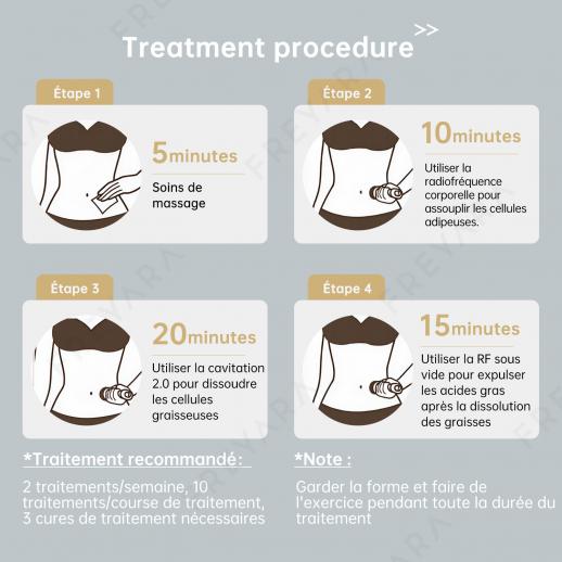 Il est recommandé d'utiliser la tête de dynamitage des graisses trois à quatre fois par semaine, et à chaque fois pendant environ 10 minutes sur une partie. La tête de radiofréquence peut être utilisée tous les jours. Ce n'est pas grave si la peau est légèrement rouge. Cela prend généralement 10 à 15 minutes. Chaque sonde doit être utilisée avec des produits, les huiles essentielles, les lotions, les crèmes et les gels sont tous OK. Ne brûlez pas la sonde à sec