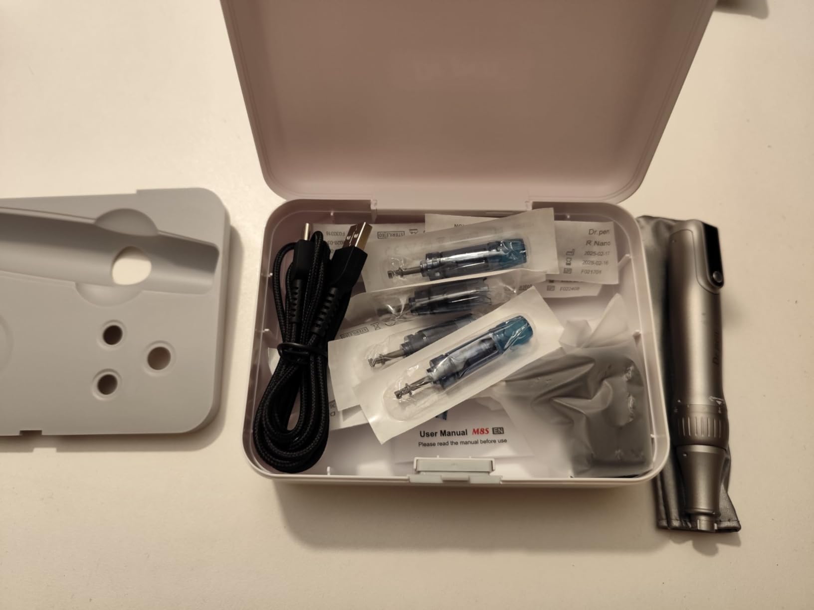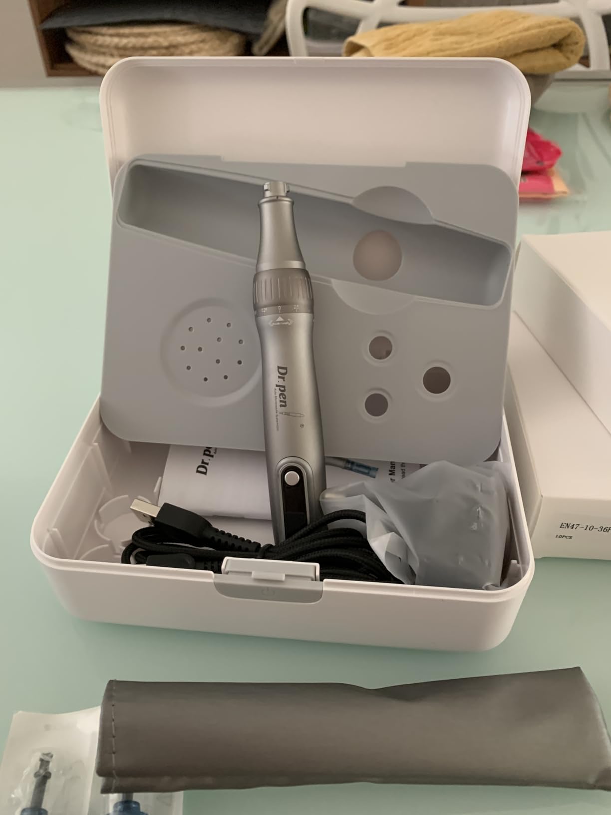 Permet d'économiser les coûts d'une visite de pratique. Comme vous le voyez sur les photos, il est livré dans un étui en plastique contenant tout ce dont vous avez besoin. Soyez bien informé avant utilisation. Est-ce que ça fait mal ? Oui, je recommande d'appliquer un peu de lidocaïne avant d'utiliser le stylo. Utilisez également un sérum, cela aide vraiment le stylo à glisser. L'acide hyaluronique est excellent, mais n'utilisez rien avec de la vitamine C ou du rétinol.