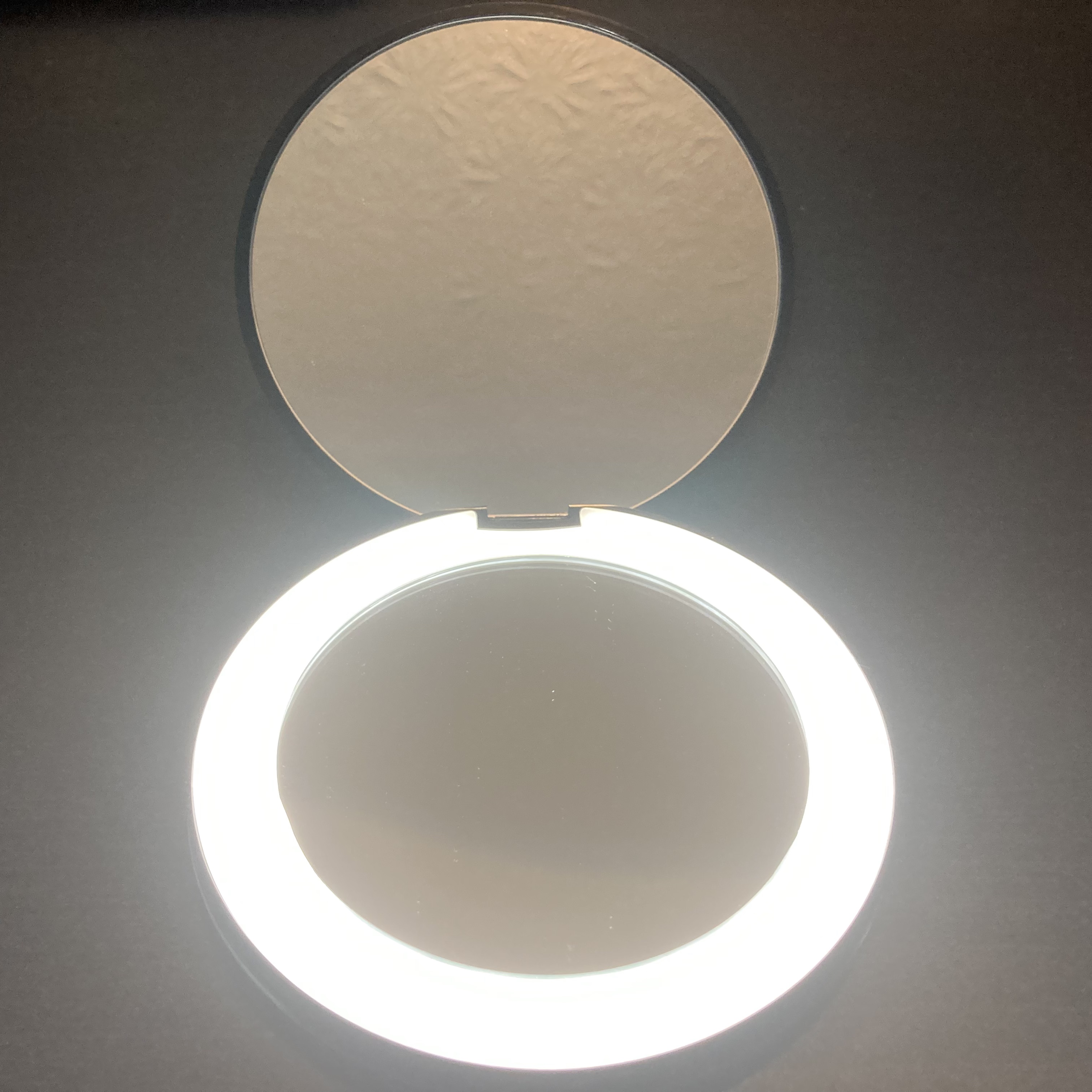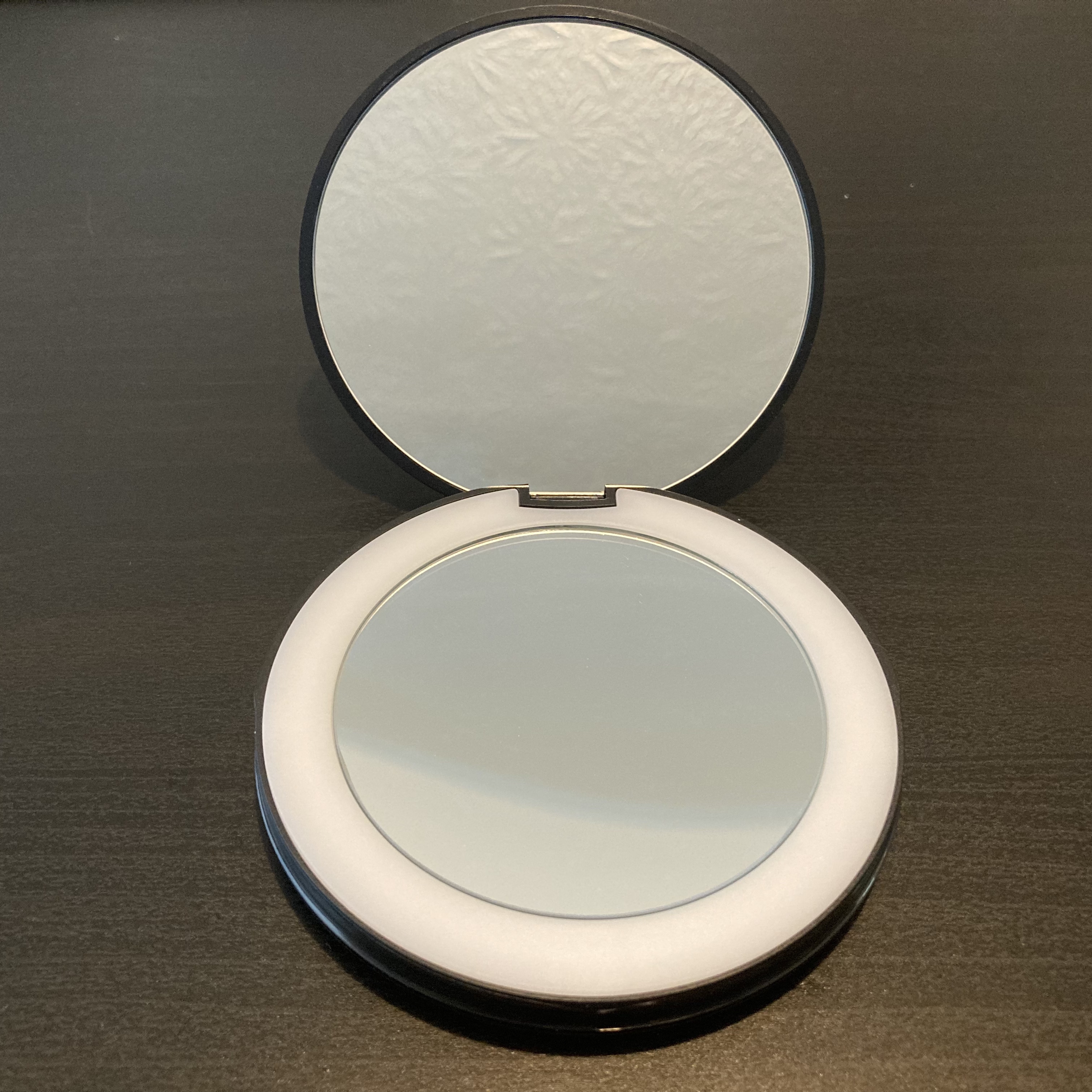 Le petit miroir de maquillage compact, éclairé et rechargeable est parfait pour la maison ou en déplacement. Lorsqu'il est ouvert, il y a deux miroirs : un normal et un avec un grossissement 10x. La lumière court autour du bord extérieur du miroir ordinaire et est allumée par un petit cercle au bas du miroir. Il a des réglages de lumière du jour et de blanc brillant et s’éteint de la même manière. Il est livré avec un câble de chargement avec une prise USB qui s'insère dans une prise de chargement non incluse. La qualité du miroir est excellente – claire, sans distorsion boudeuse. Certainement un accroche-regard.