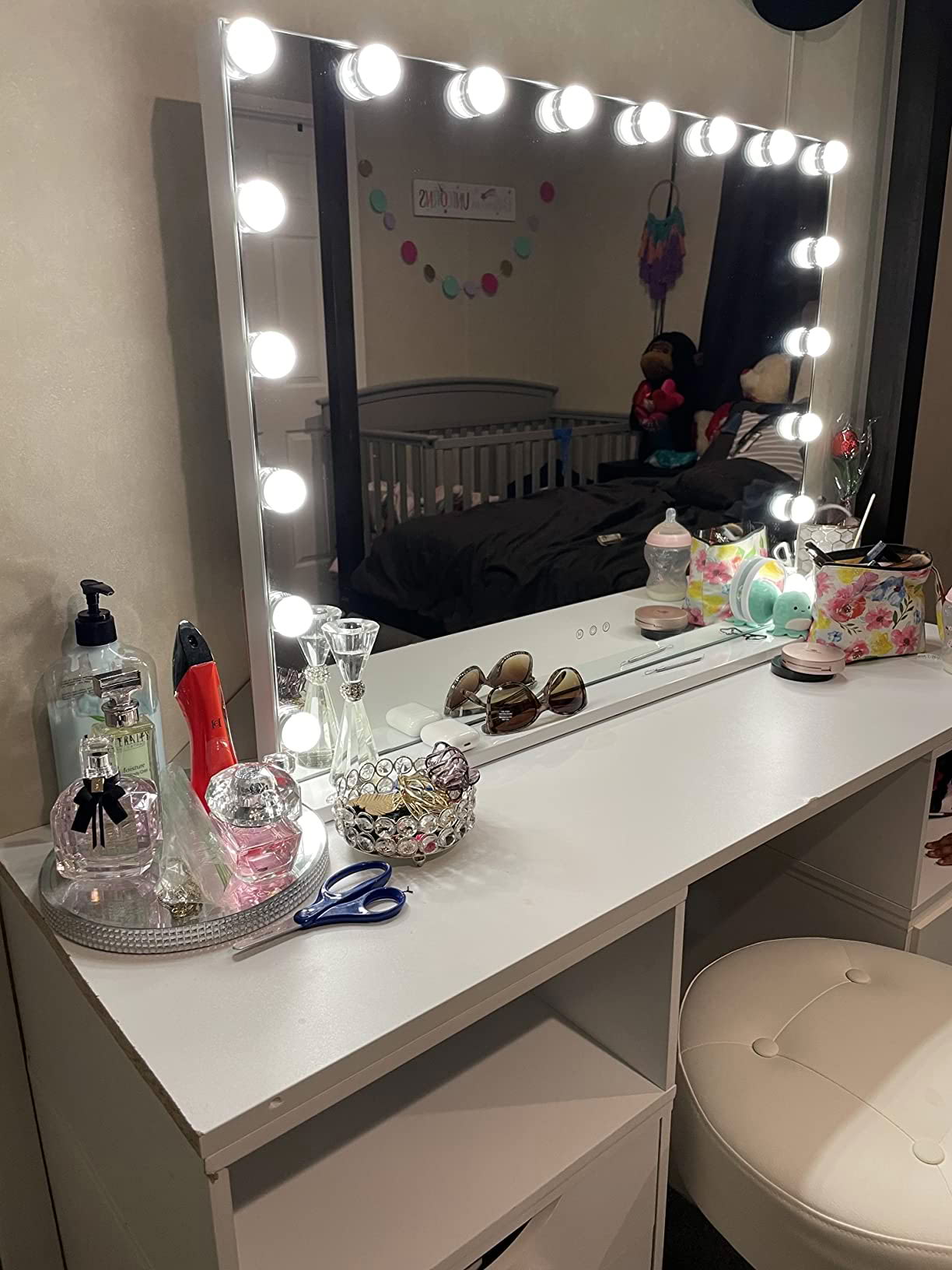 J'aurais aimé l'acheter il y a des années. Il repose magnifiquement sur ma nouvelle table et a aidé mon maquillage à être bien meilleur. Et j'aime beaucoup la taille du miroir. C'est un excellent prix par rapport à d'autres magasins qui les vendent à 300 $ et plus ! J'adore pouvoir modifier les paramètres d'éclairage et recharger mon téléphone ! Je ne peux que recommander chaleureusement son achat :)