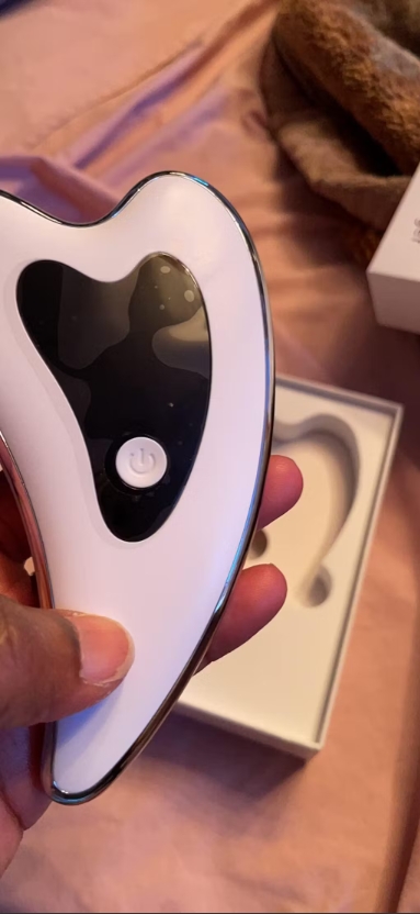 J'utilise le Gua Sha depuis plusieurs années avec une pierre Gua Sha en jade ou en quartz rose, puis j'applique une lumière rouge. Cet outil a attiré mon attention car il intègre les deux éléments ainsi que le massage. Il dispose de plusieurs réglages : lifting, antirides, massage et raffermissement. Lorsque vous utilisez les réglages de massage ou de raffermissement, une lumière bleue ou rouge l'accompagne et est légèrement chaude. Cela ressemble plus à un soin de spa qu'à une séance de Gua Sha à domicile.