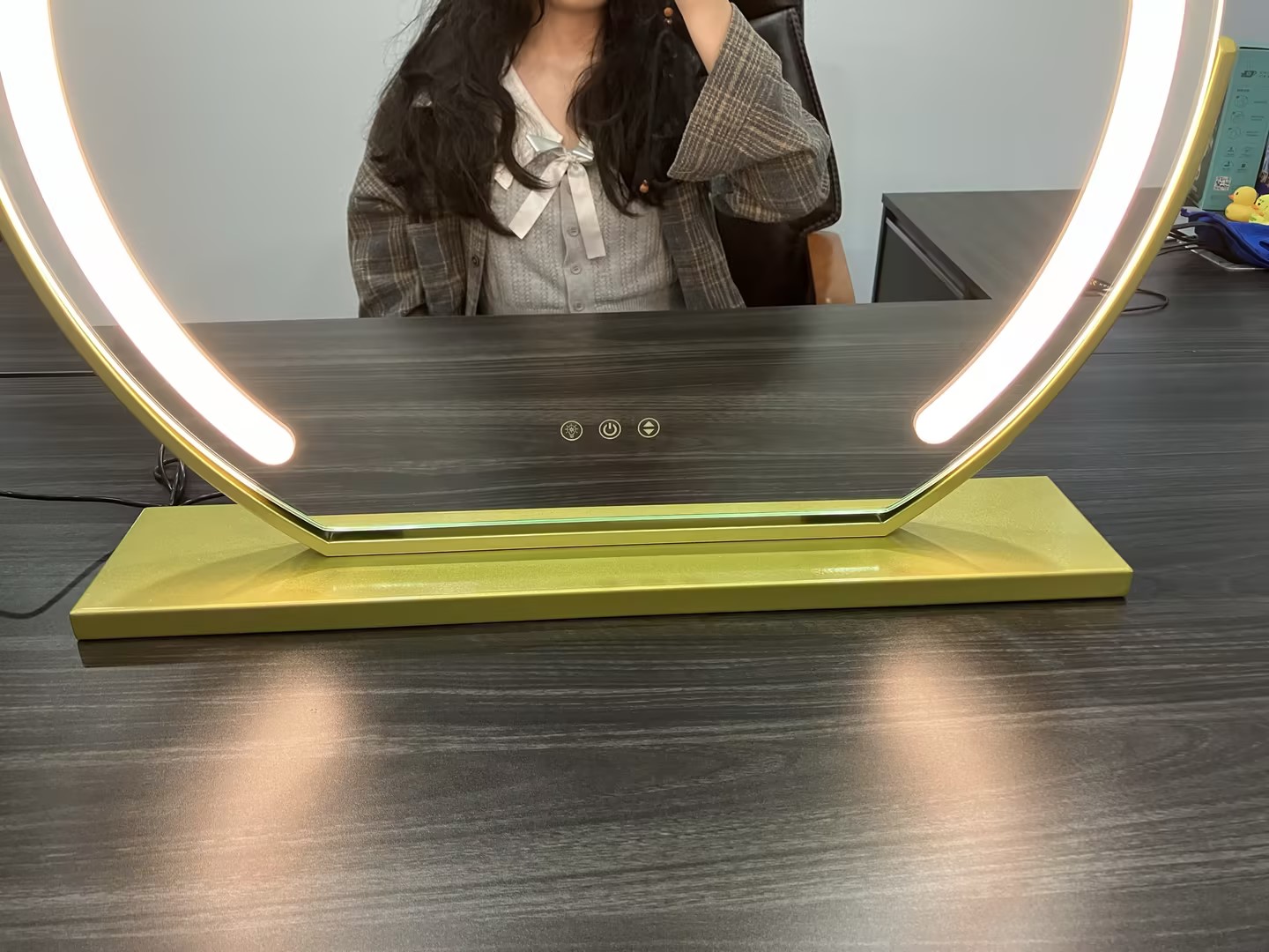 Ce miroir est GÉNIAL. J'ADORE le bouton d'alimentation tactile, il est si facile de changer le mode d'éclairage et il a juste la bonne quantité de lumières dessus. Il est magnifique sur ma coiffeuse et l'inclinaison est également excellente. Il a une base lourde et robuste, donc je n'ai pas peur qu'il bascule. Je ne pourrais pas être plus heureuse avec lui !!