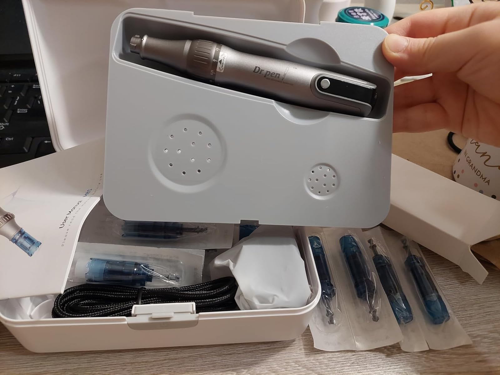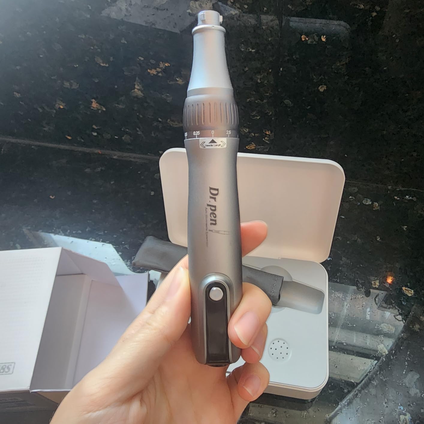 Au départ, j'utilisais un tampon à micro-aiguilles, mais j'ai décidé d'en essayer un électrique et j'ai acheté celui-ci. Je le trouve plus efficace car je peux régler la vitesse de vibration et la longueur de l'aiguille. Personnellement, je trouve celle à 18 aiguilles un peu douloureuse, mais avec les autres je ne ressens pas grand chose. La taille de la boîte est beaucoup plus petite que ce à quoi je m'attendais, ce qui facilite son rangement.