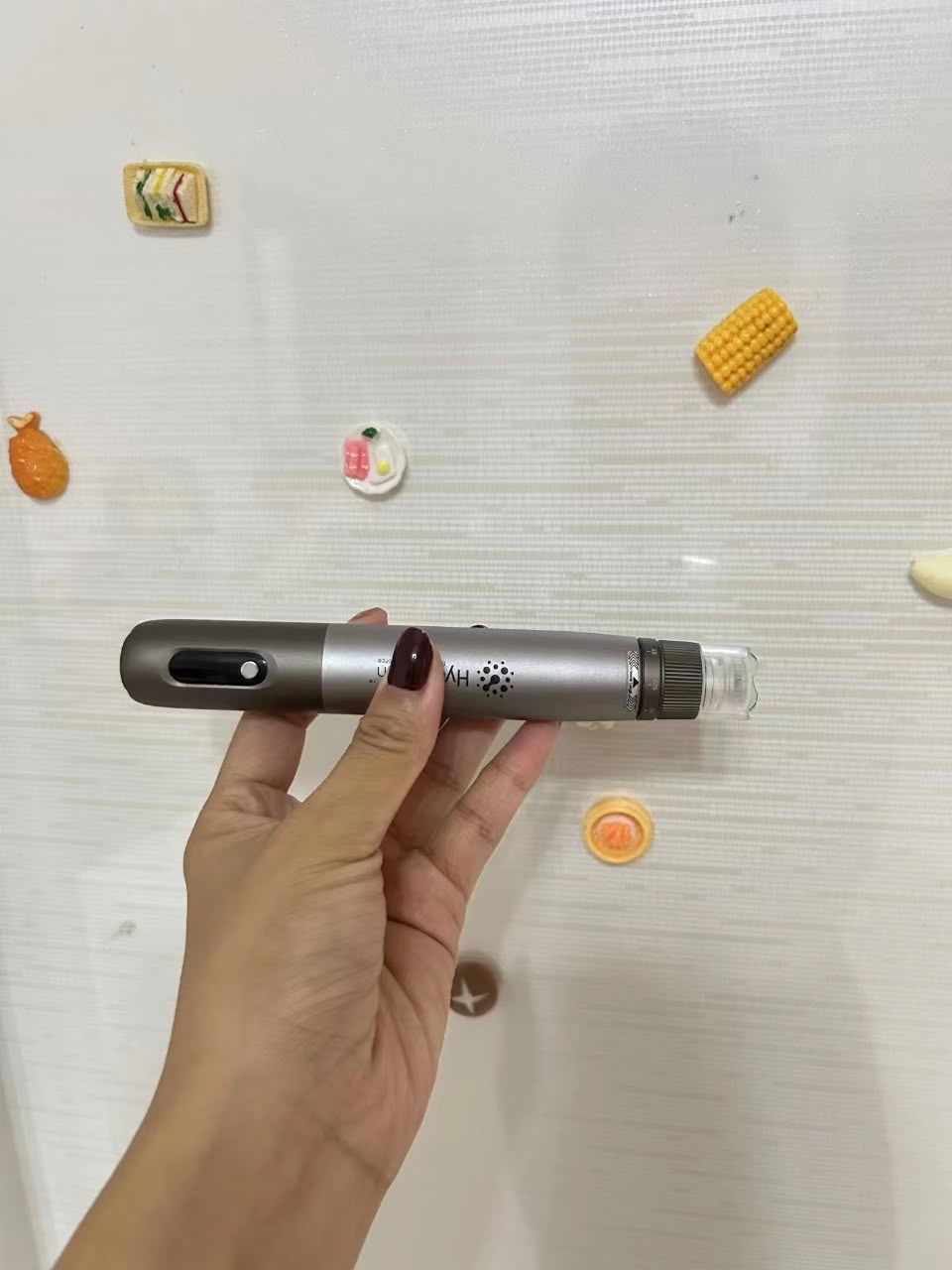 Pour ma première séance j'ai utilisé un sérum d'acide hyaluronique 4D (4 types d'acide hyaluronique). Le sérum, pensais-je, était plus épais ; j'ai donc réglé le stylo sur 3 pour la distribution du liquide. Si le sérum est fluide, le réglage 1 ou 2 peut être utilisé.