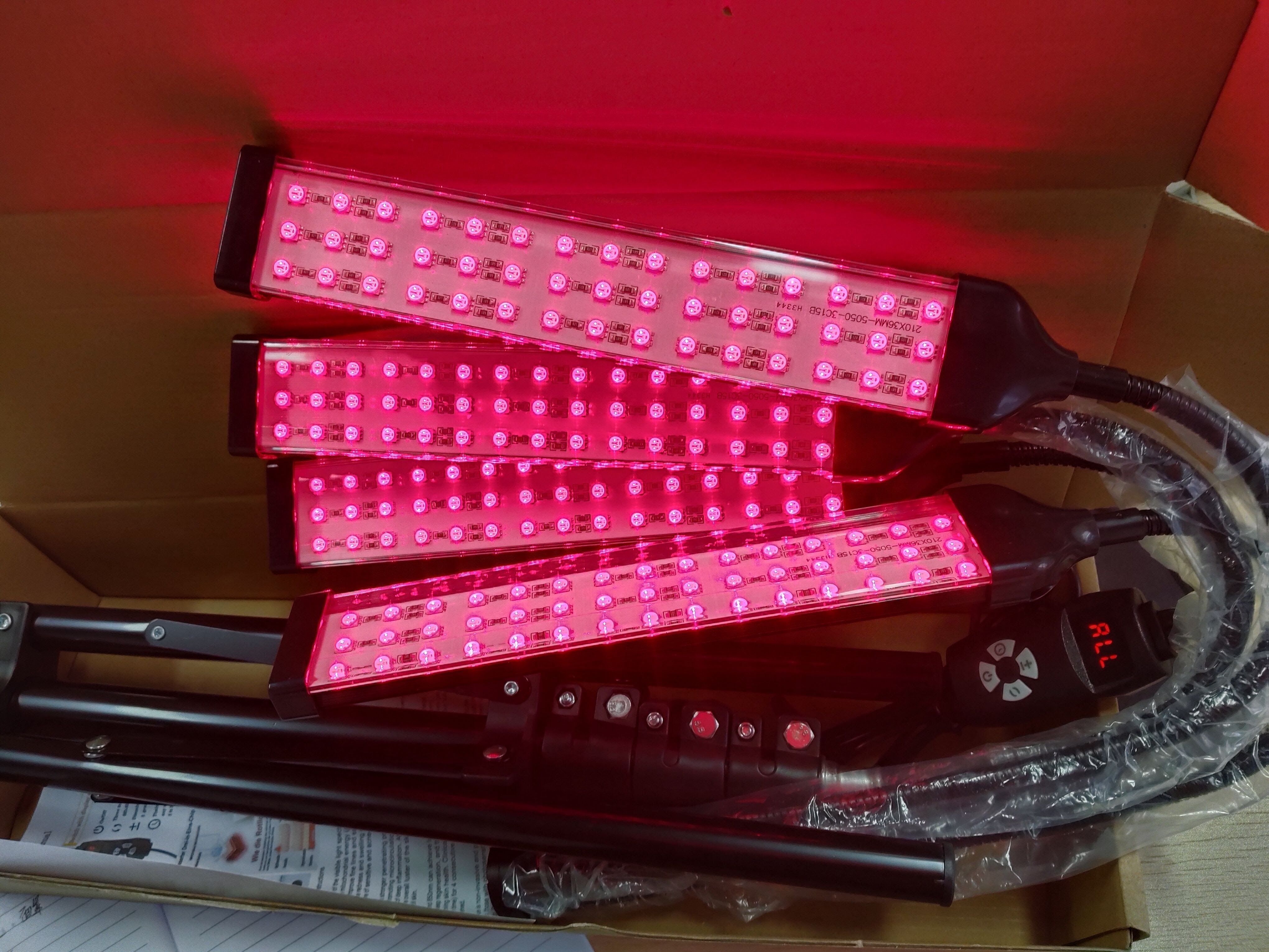 Une fois tout installé, j'ai pu le régler facilement, y compris les panneaux. J'ai pu ajuster la hauteur et l'angle, nécessaires pour traiter différentes zones du corps. Ce modèle est équipé de quatre panneaux RLT au lieu de deux habituellement et est fourni avec des lunettes de protection.